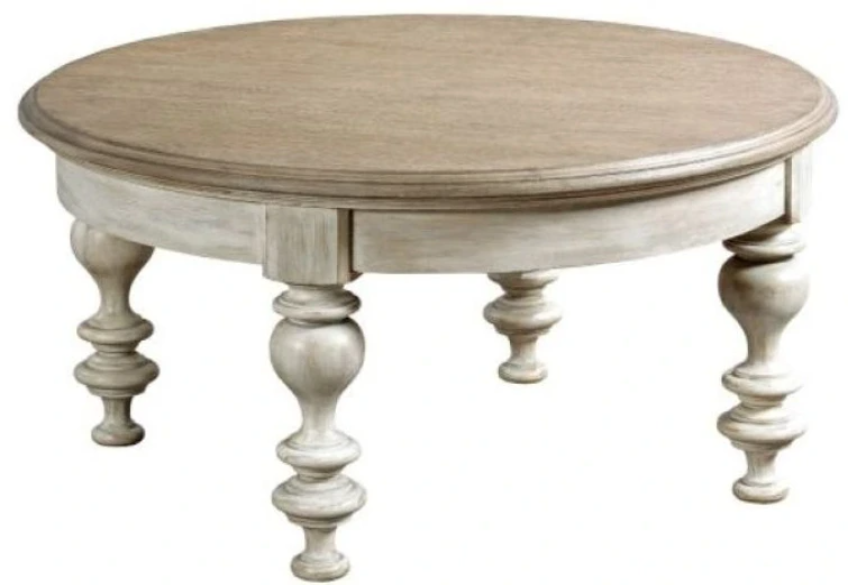 The collection features thick oak veneers in a driftwood finish against the soft texture of sun-washed paint. Metal elements along with accents of denim blue and natural, woven cane add to the personality. Perfectly sized 40" round coffee table that has turned legs and is casual that fits any room decor.Read More