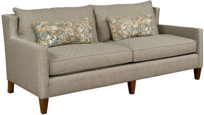 The sofa has a loose pillow back. Also included are two large kidney pillows.Read More