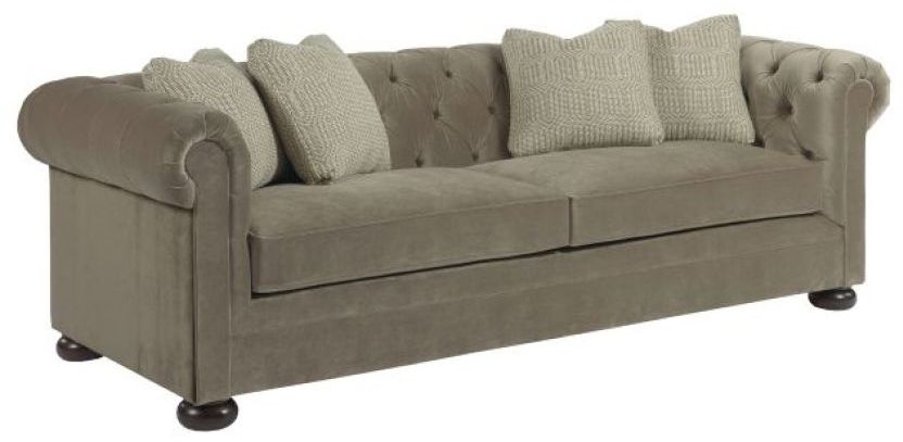 Evoking a heritage of fine furniture design.The Camden Chesterfield Sofa with Toss Pillows and Wooden Bun Feetsofa is the ideal centerpiece for any traditional room decor. Your heirloom-quality sofa comes standard with four toss pillows. Choose to epress yourself! This item has custom options available.